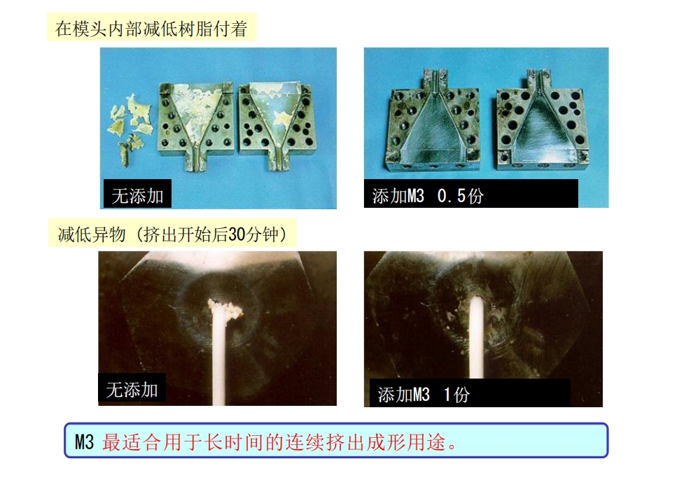 M3超膜光亮剂与其它润滑剂有良好的协同效果,提高其它成份在塑料中分散性。使制品有光泽,色彩均匀鲜艳,不易影响塑料制品的物理性能及二次加工的性能,在加工过程中不易分解、不易挥发。